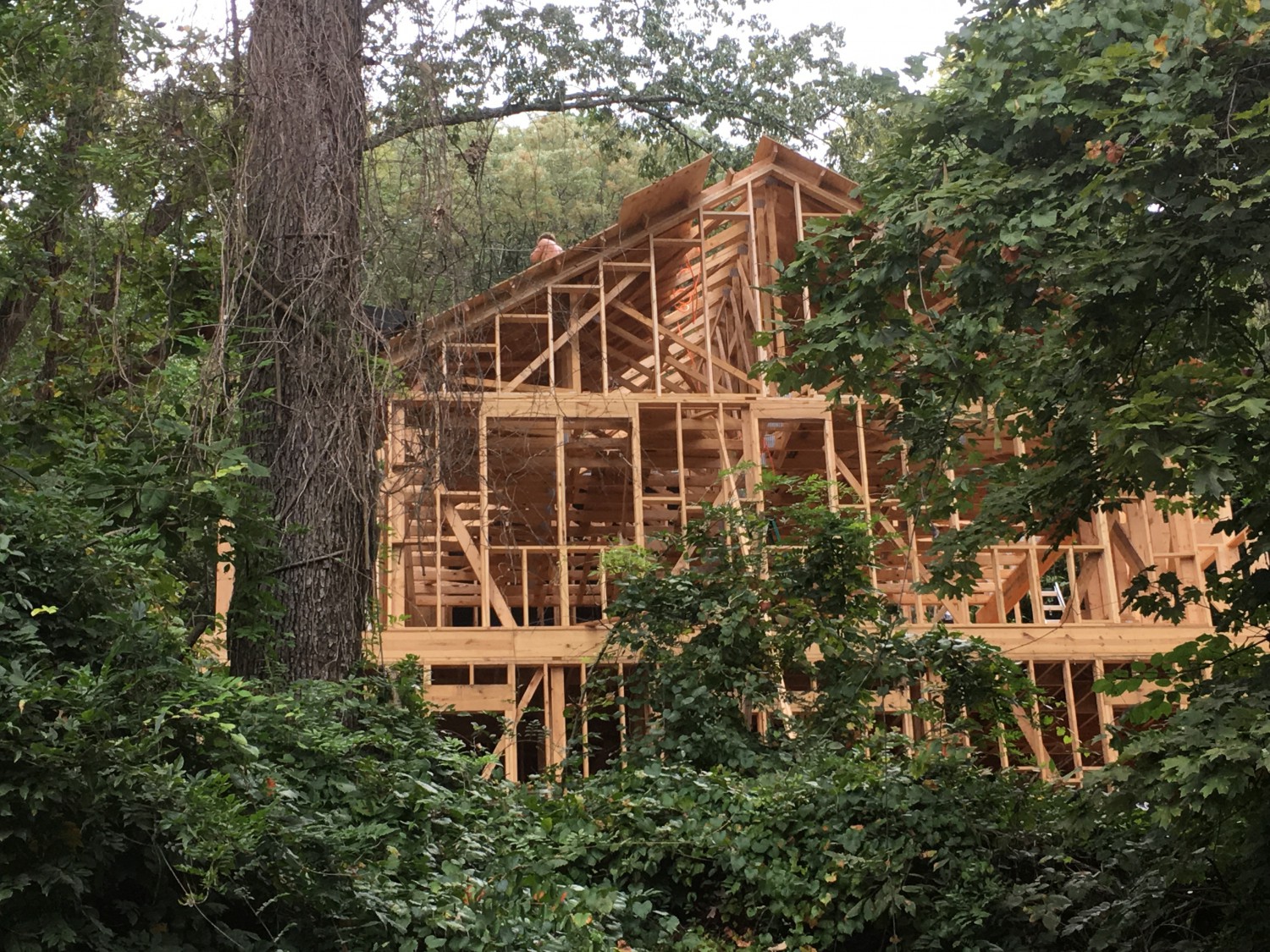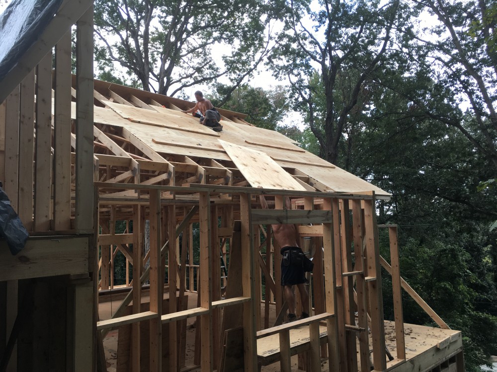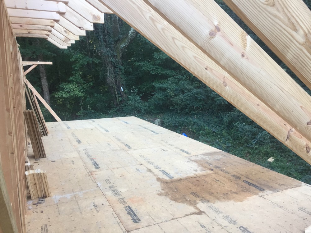Yet again, we found ourselves in a race against the clock. In early October, a massive rainstorm threatened to strike at the same time as the residual effects of hurricane Matthew came in from the other direction. We were expecting more than three inches of rain and potential 50 mile per hour winds. In order to mitigate the damage, we made a mad rush to install the roof decking atop the trusses.