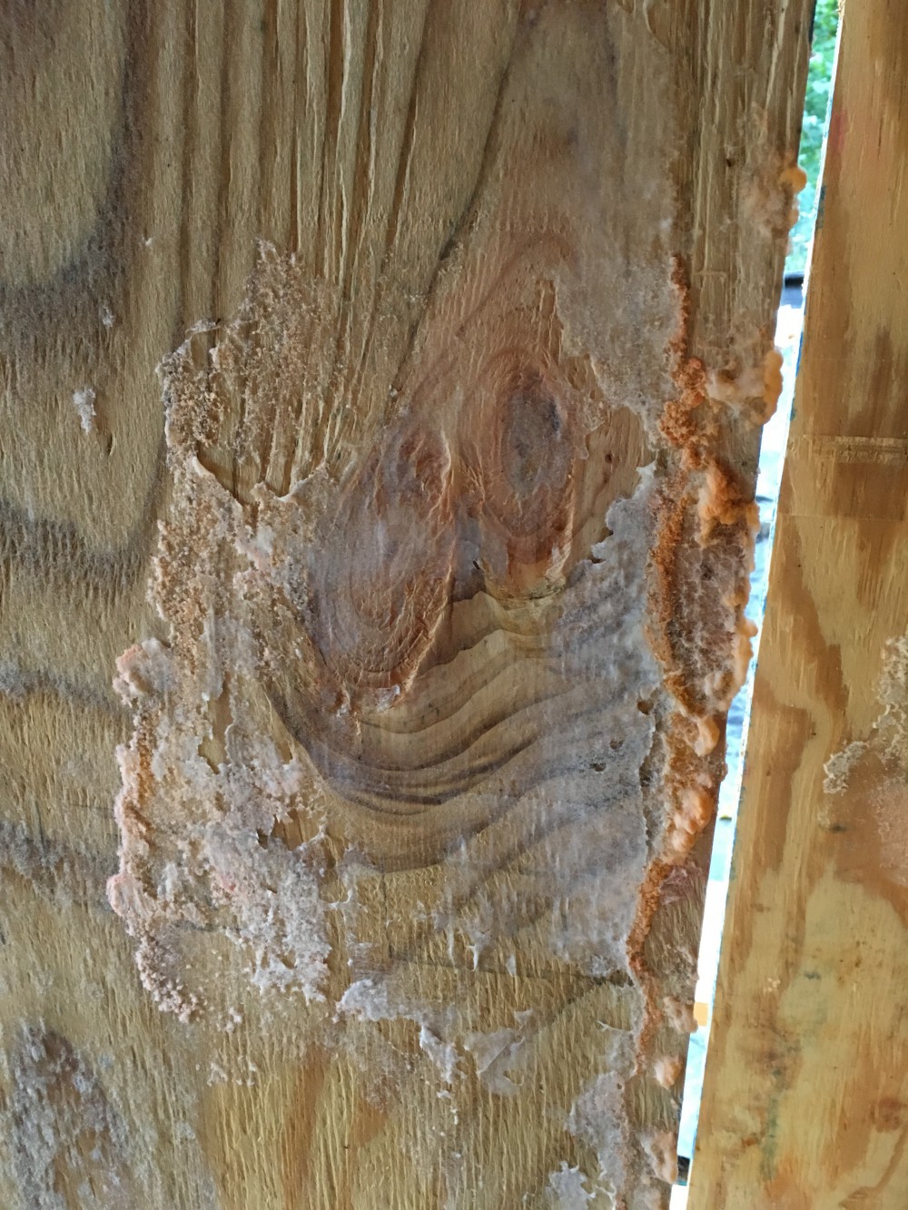 By the time we were ready to attach the plywood decking sheets to the rest of the roof, we found that the wood we had left wrapped in plastic had grown mold. A fuzzy – and putrid smelling – orange fungus had grown on every single sheet. We needed the wood, so I strapped on a mask and set to scrubbing.