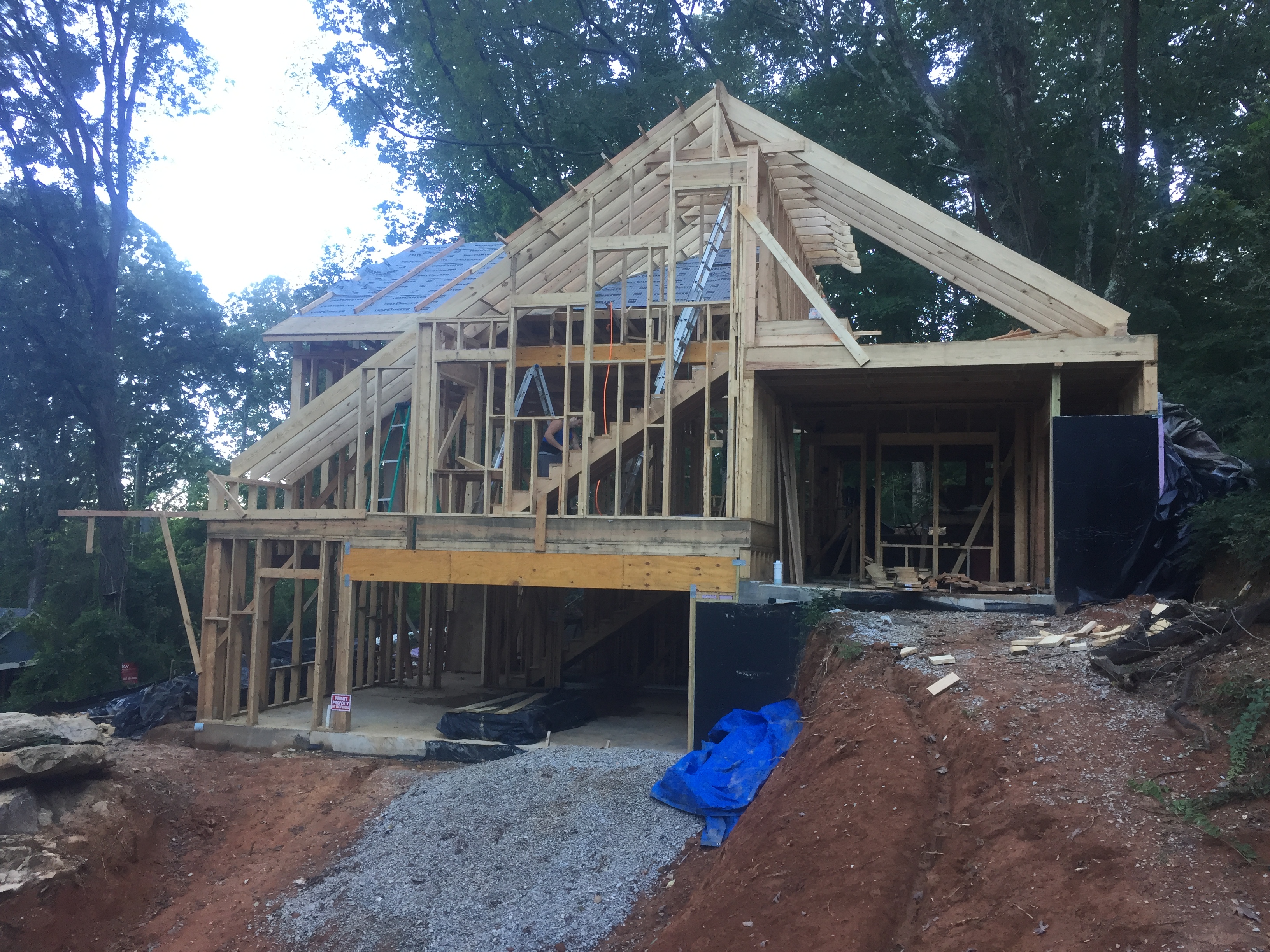Feeling a little more relaxed now that the main part of the house had some level of coverage, we took a more methodical approach to the rest of the roofing structure. Over the next week or so, we completed the rest of the framing for the roof outside of the dormer: